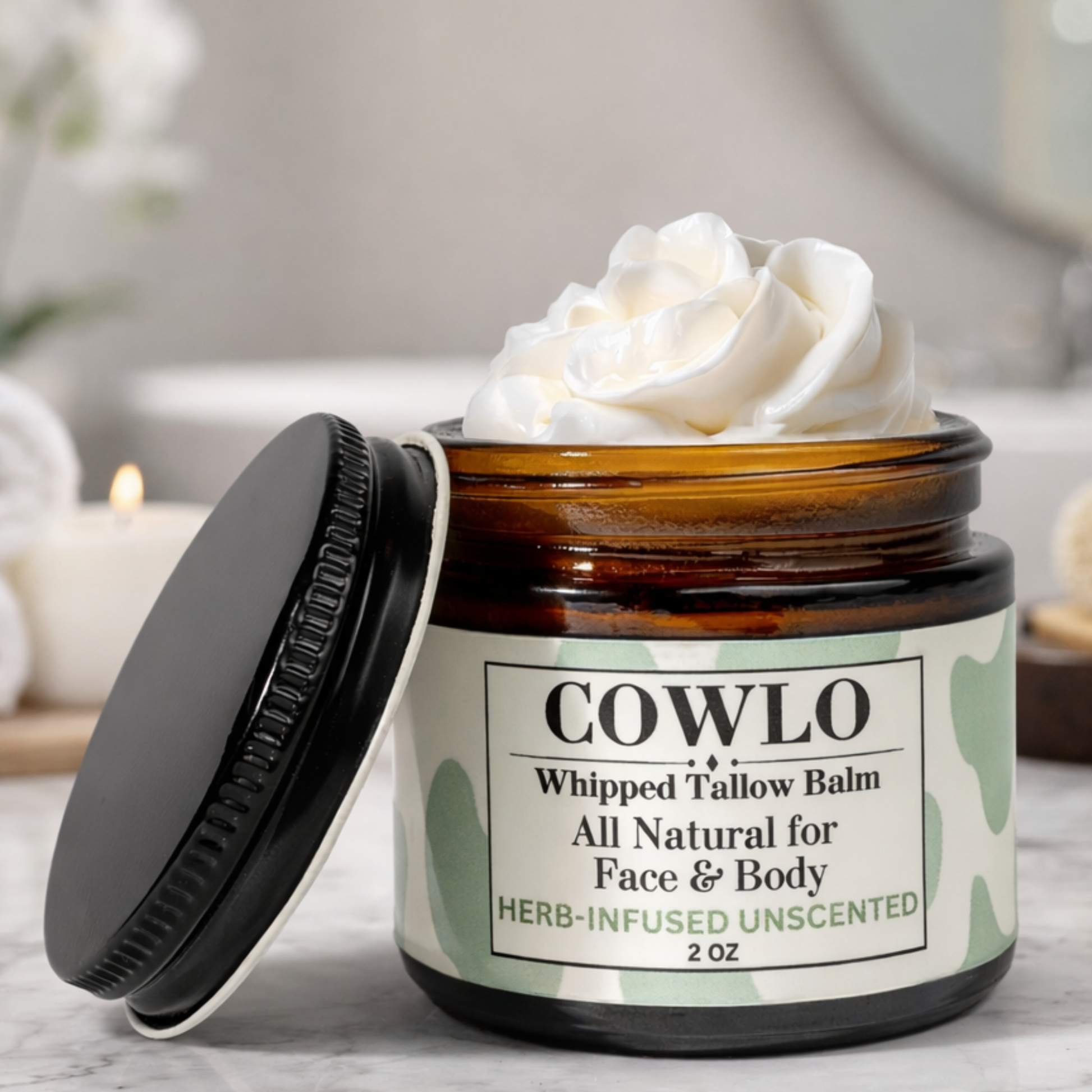 Support and restore your skin with our Cowlo Herb-Infused Whipped Tallow Balm, crafted with powerful botanical infusions for sensitive, irritated, or dry skin. This soothing balm blends nutrient-rich grass-fed tallow with herbal-infused olive oil to hydrate deeply, calm inflammation, and promote radiant, healthy skin.